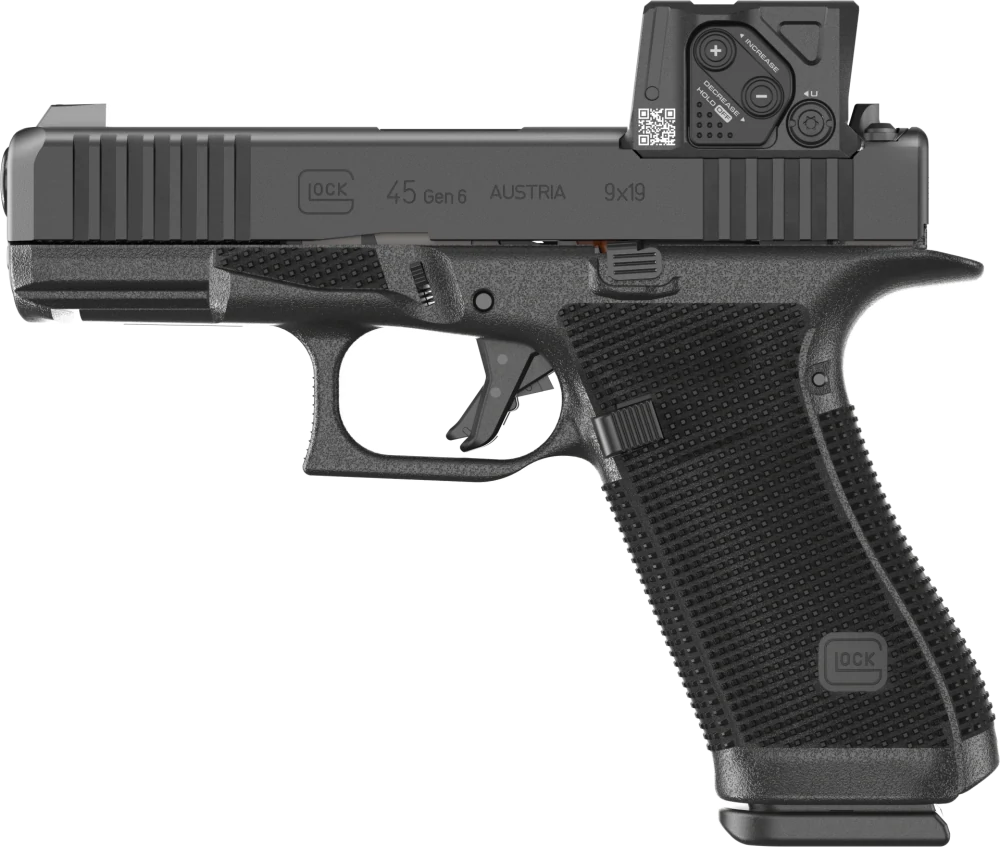 Glock 45 Gen6 A-CUT je pistole velikosti CROSSOVER v ráži 9 mm Luger v konfiguraci s kolimátorem Aimpoint COA, se závěrem s modulárním optickým systémem konstruovaným pro kolimátor Aimpoint COA.