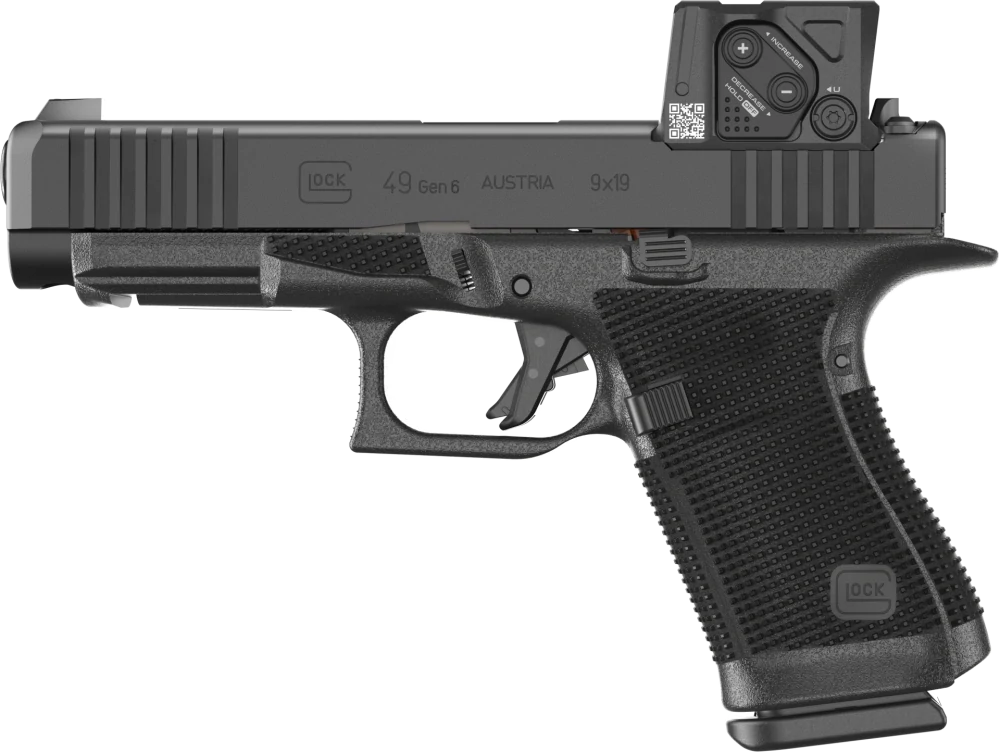 Glock 49 Gen6 A-CUT je pistole velikosti CROSSOVER v ráži 9 mm Luger v konfiguraci s kolimátorem Aimpoint COA, se závěrem s modulárním optickým systémem konstruovaným pro kolimátor Aimpoint COA.